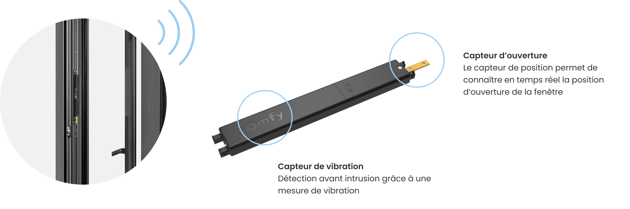 Développée avec Somfy®, cette nouvelle fonctionnalité, ne se contente pas de donner un état de chaque ouverture (fermée – ouverte – entrouverte), comme le font la plupart des options sur le marché : la mesure et l’analyse de vibrations rend la fenêtre « pro-active » en lui permettant – par transmission de l’information vers une box TaHoma® Somfy® – de déclencher immédiatement un scénario défini.